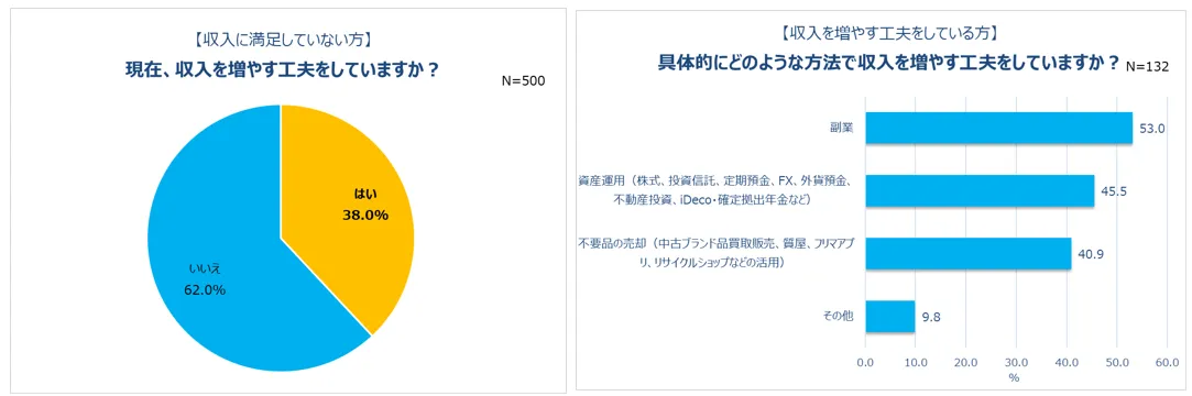収入が減る一方で支出は増加し、現状の収入に満足していない人の方が多いことが分かりましたが、収入を増やす工夫をしているのか調査しました。結果、工夫をしている人は38.0%と約4割の人が自身の収入に対して何かしらの対策をとっていることが伺えます。逆に6割以上の人は、収入に満足していない、という意識を持ちながらも、自ら増やす工夫をしていないという意識に対する行動の欠如が見受けられます。