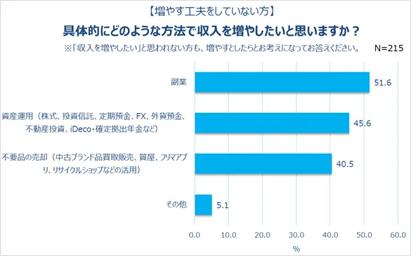 収入には満足していないものの増やす工夫をしていない人にも、前項と同様に増やすとしたらどんな方法で行いたいか質問しました。結果、半数以上の人が「副業」(51.6%)、次いで既に工夫をしている人の結果同様、「資産運用」(45.6%)、「不要品の売却」(40.5%)と回答しました。工夫の有無に限らず、副業の選択肢のバランスは変わらないようです。コロナ禍で、副業を認める企業が増えたという時代の流れがこの結果に繋がった背景としても考えれます。また、リモートワークの浸透により、時間に余裕ができ、家でできる手軽な副業をする人が多いことも予想されます。おうち時間を活用して、収入を得られるのは効率的です。