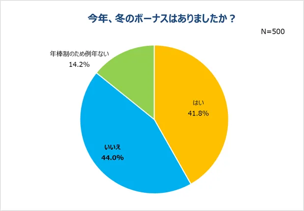 収入が減った人が一定数いることがわかりましたが、今年の冬のボーナスはどうなるのか気になるところです。冬のボーナスがあったか聞いたところ、年俸制のため例年支給されてない14.2%の人以外に、44.0%の人が「いいえ」と回答しました。ボーナスがあった人は41.8%と、若干ではありますがなかった人の方が多い結果となりました。例年ボーナスがある企業に勤めている人で今年もらえないとなると、痛手となりそうです。