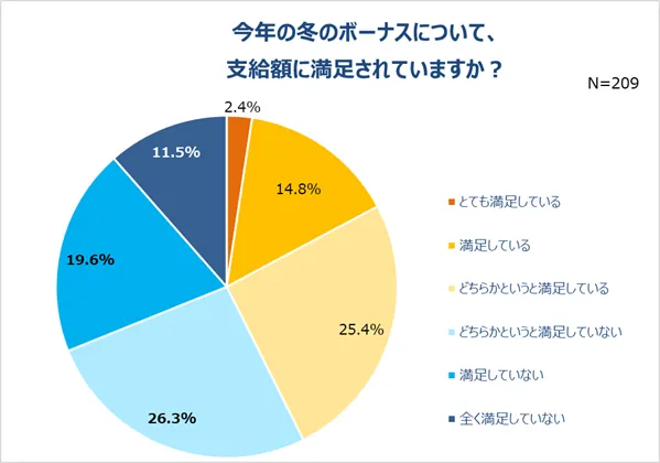 今年冬のボーナスをもらった人に、そのボーナスについて詳しく調査しました。まず、もらった支給額に満足しているか質問。「全く満足していない」(11.5%)、「満足していない」(19.6%)、「どちらかというと満足していない」(26.3%)人を合わせて6割近い人が、ボーナスの支給額に満足していないことが判明しました。やはり満足していない人が多数派のようです。