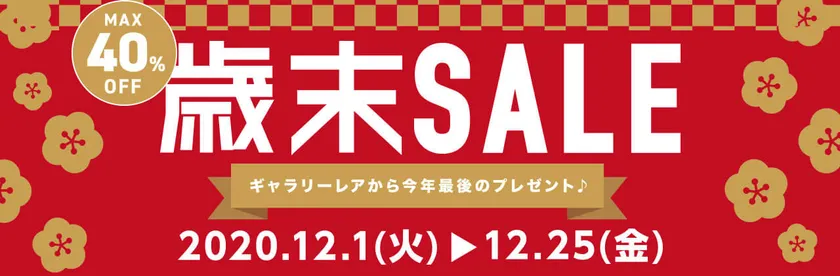 株式会社ギャラリーレア(本社:大阪市西区、代表取締役社長:石崎 桂司、以下 ギャラリーレア)は、1,200点以上のアイテムが最大40%OFFとなる『歳末売り尽くしセール』を、2020年12月25日(金)まで開催いたします。