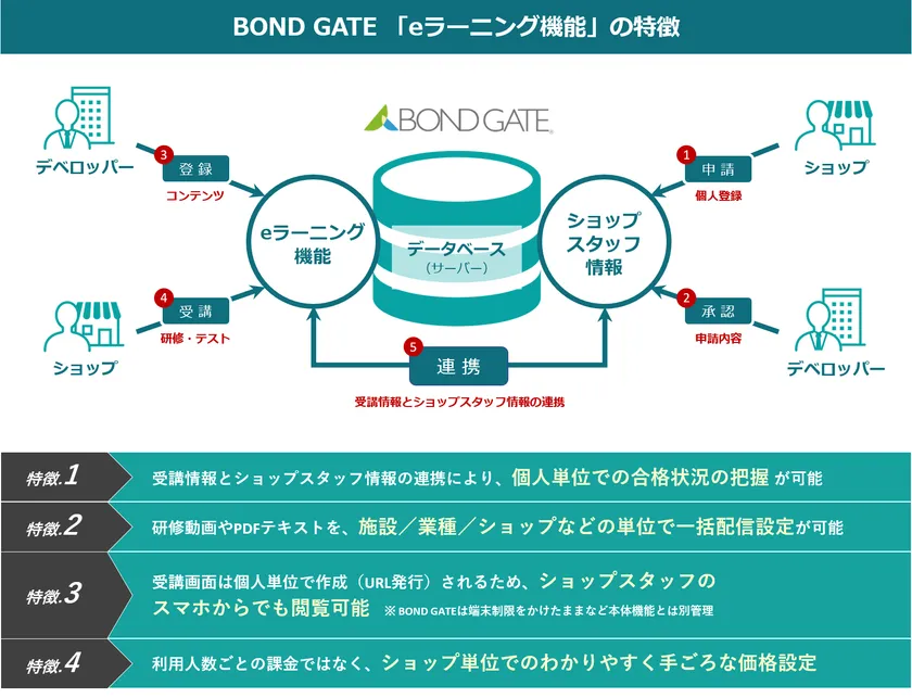 まず1点目は、デベロッパー・ショップ双方向のより充実したコミュニケーションを目指す「動画埋め込み機能」、そして2点目は、インターネットを利用しPC・タブレット・スマートフォン上でいつでもどこでも学習・受講できるeラーニング機能となります。