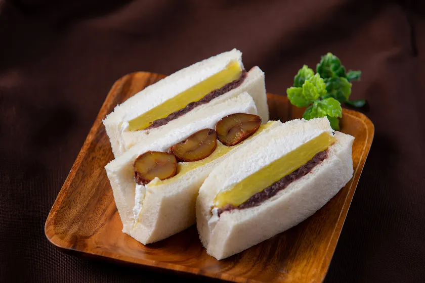 いきなり団子がサンドイッチになった、当店だけのお芋スイーツです。食パン専門店「食ぱん四二八」のフルーツサンド専用食パンに、焼き芋と餡子、生クリームをサンド。生クリームと餡子の組み合わせも絶妙な、より気軽にお召し上がりいただける商品に仕上がっています。栗の渋皮煮が餡子の代わりに入り季節感のあふれる、いもくりサンドもご用意しております。