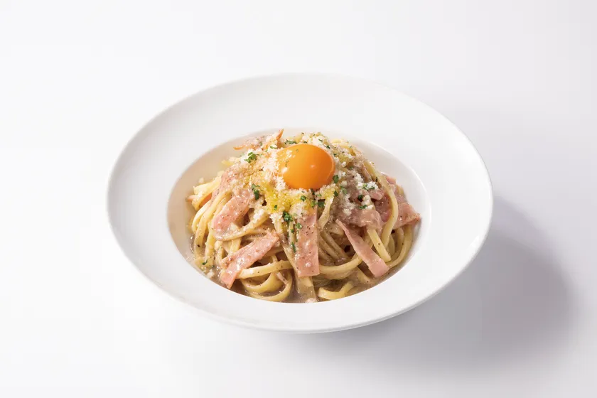 ピエモンテ州が名産のトリュフをベーコンと共にクリームソースに仕立て、仕上げに卵黄風のソースをトッピングしました。もちもちとした食感のタリオリーニとトリュフクリーム、卵黄風のソースの相性が抜群な一品です。