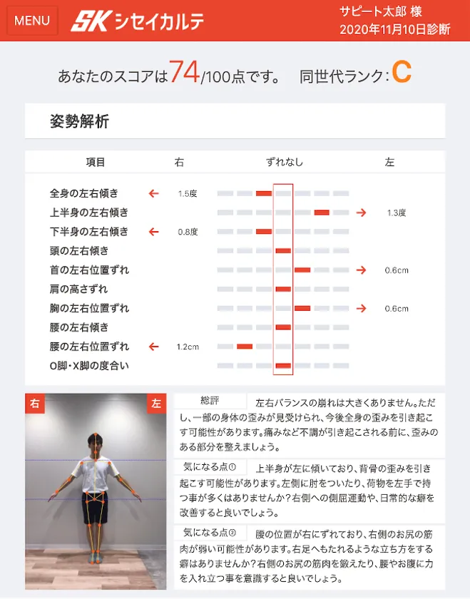 数十箇所に及ぶ解析項目を、それぞれ10mm、0.1度単位で詳細に分析。分析結果は点数とグラフを中心とした構成で、どなたでも視覚的に解りやすいレポート内容です。