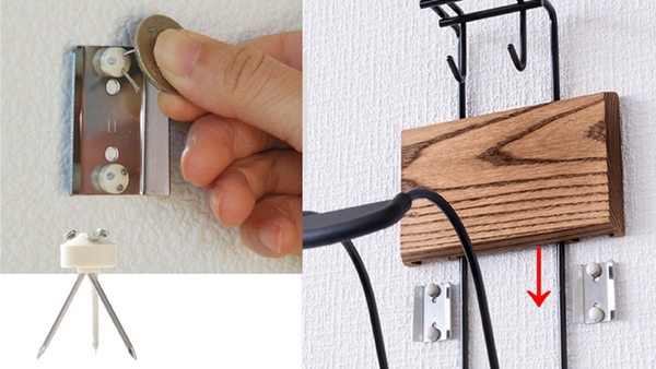 取り付けは虫ピン状の石膏ボード壁専用の細い釘をコイン等で押し込むだけの簡単設置。