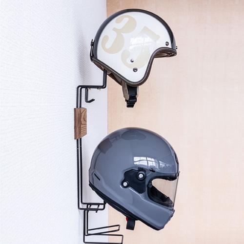 室内の壁にまるでショップのディスプレイのようにカッコ良く収納。フルフェイス、ジェット、オフロード用、各種オートバイ用ヘルメットに対応します。
