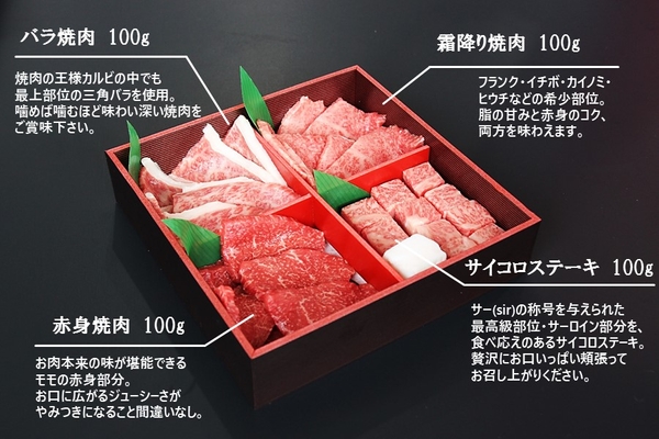 兵庫県が誇る「神戸ビーフ」のロースステーキ・肩ロースすき焼き用・焼肉用4種(合計880g)を2段のお重にお詰めしました。お届け日は、12月28日(水)~12月30日(金)の中からご指定いただけます。