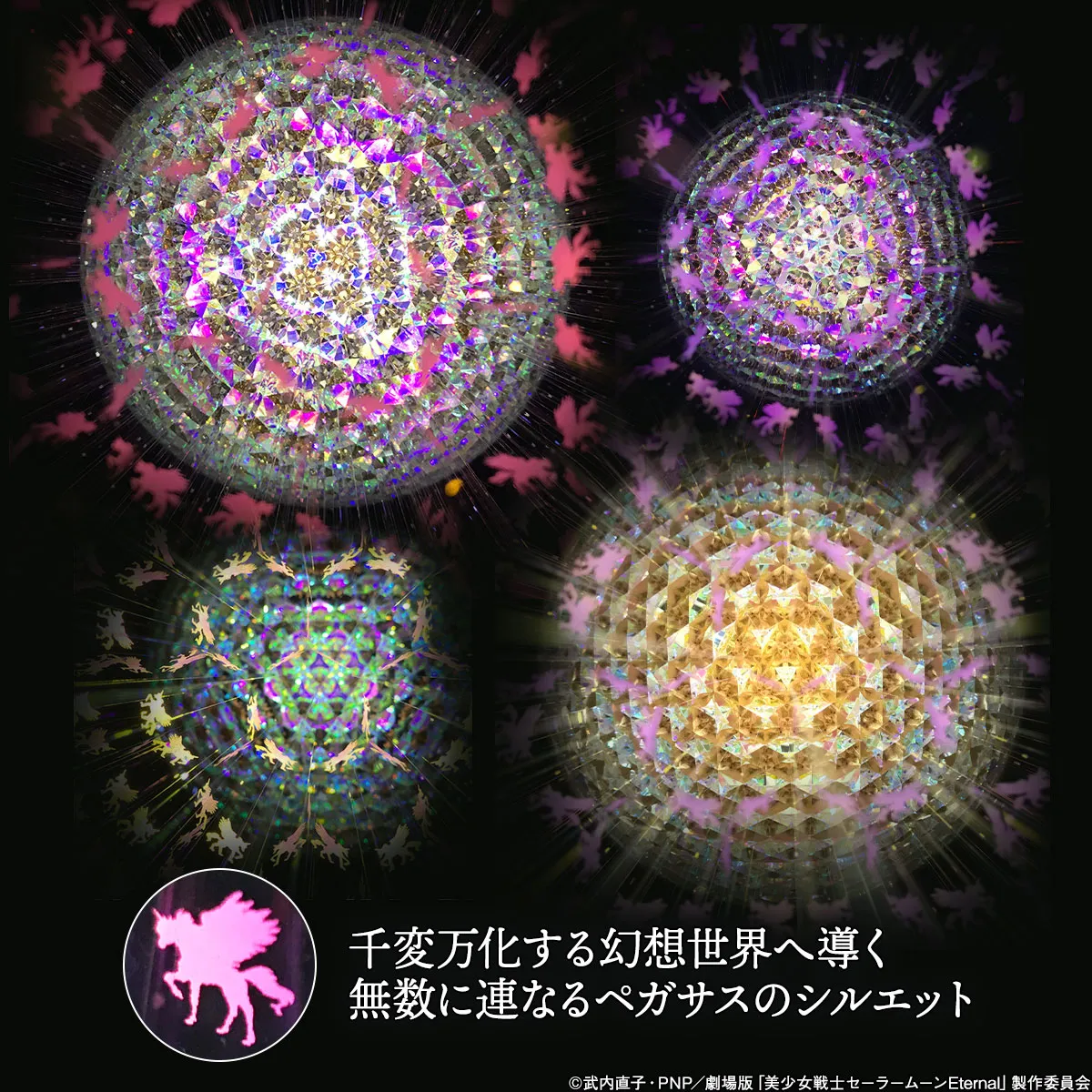 夢見る乙女を虜にしたガラスの万華鏡を劇中のイメージそのままに再現。万華鏡の先端・セルの中には、7色に光る星屑のオブジェクトともに、クライシス・ムーン・コンパクト、ちびムーン・コンパクト、幻の銀水晶のオブジェクトが詰め込められました。