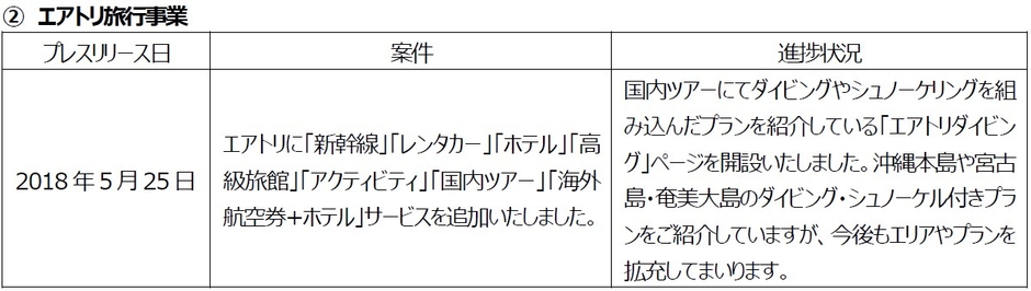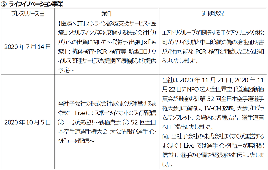 One Asiaのビジョンをかかげ、アジアを舞台に、エアトリ旅行事業、訪日旅行事業、ITオフショア開発事業、ライフイノベーション事業と投資事業を手掛ける株式会社エアトリ(本社:東京都港区、代表取締役社長 兼 CFO:柴田 裕亮、証券コード:6191、以下当社) は、これまでに発表いたしましたプレスリリースの各案件につき、12月1日時点において進捗がありました主な案件の状況について、以下の通りご報告いたします。