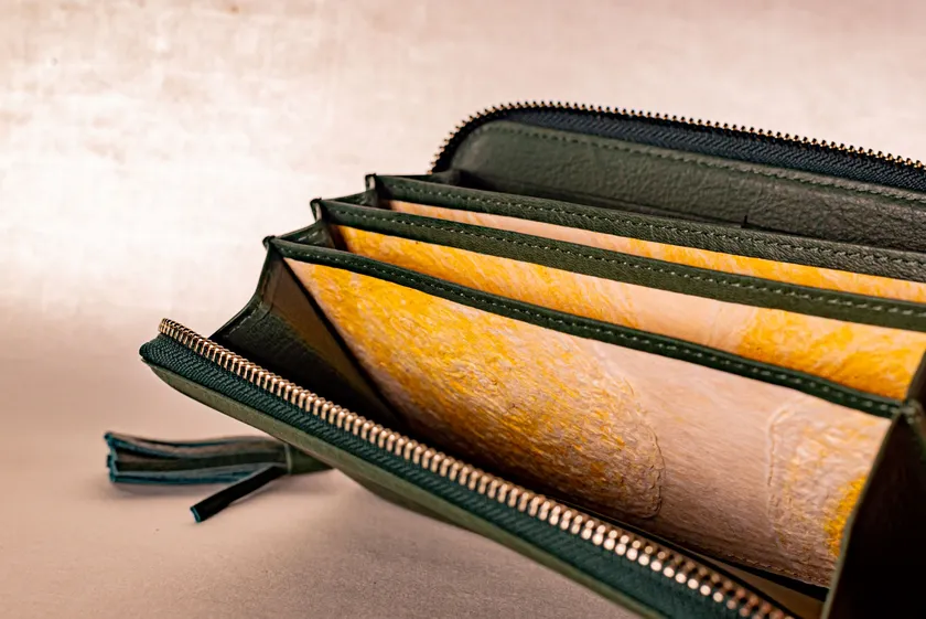 越前和紙は、蓄財の色として知られる黄金色をベースにし、“幸せの輪が広がるように”と円環の模様を施しました。深碧のシックな鹿革の長財布を開けるたびに、明るく黄金に輝く越前和紙の美しさが映えて、温かい豊かな気持ちへと誘います。年齢・性別を選ばない品の良いデザインで、自分へのごほうびや大切な方への贈り物にも最適です。