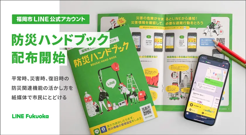 LINE Fukuoka株式会社(本社:福岡県福岡市博多区、代表取締役社長:落合 紀貴)は、福岡市と共働してサービスを提供している福岡市LINE公式アカウントに搭載した防災関連の機能について周知し、利活用を促進するため、平常時、災害時、復旧時の時系列で活用法をまとめた「福岡市LINE公式アカウント 防災ハンドブック」を制作し、福岡市民に向け配布を開始したことをお知らせいたします。