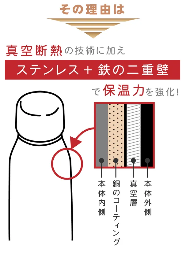 2. 二重のステンレス製サーマルボトルを採用。キンキンに冷えたお水、熱いお茶といつでも飲み頃をキープ。