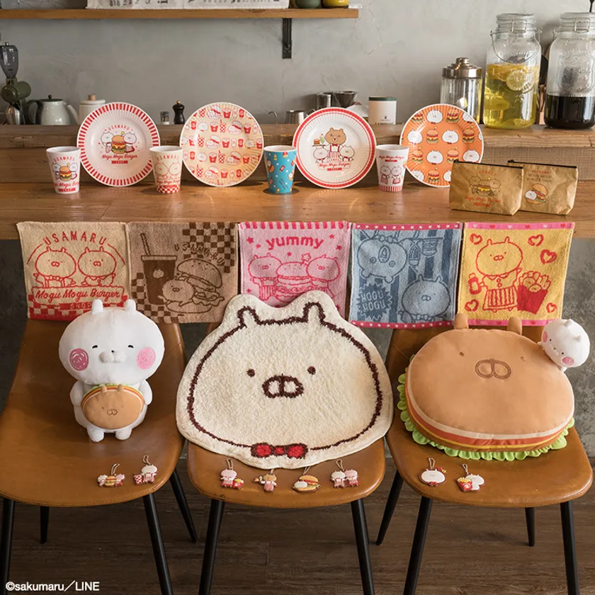バーガーを食べるうさまるのぬいぐるみ、バーガーに飛びつくうさまるのクッションは、柔らかな手触り。バーガーショップ気分が楽しめる紙皿風のプレートやかわいいデザインのカップは、ともにメラミン素材のため割れにくく、持ち運びしやすいアイテム。テイクアウトの紙袋をイメージしたポーチは内生地もマチもついているので収納にも便利です。このほか、タオルやラバーチャームなどイラストが堪能できるキュートなデザインのアイテムもラインナップ。