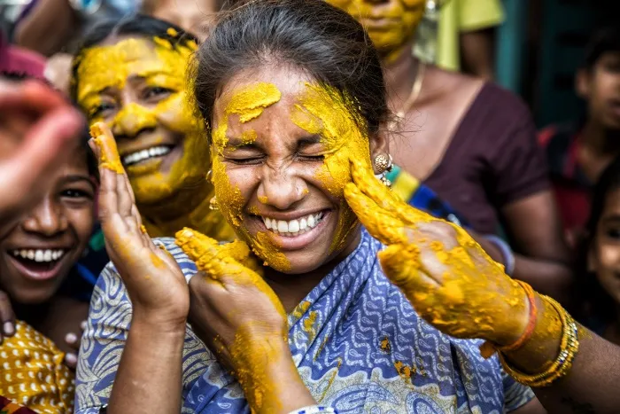 インドには結婚式を迎える新郎新婦とその家族が顔にターメリック(ウコン)を塗る習慣がある。(インド)