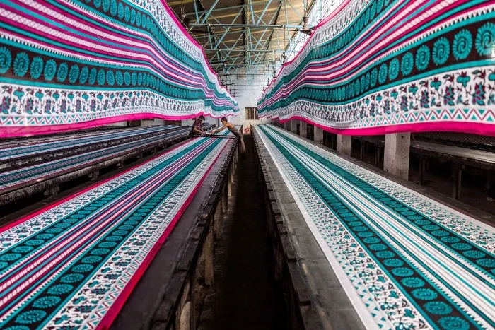 プリント作業は二人の職人がぴったりと息を合わせて行う。