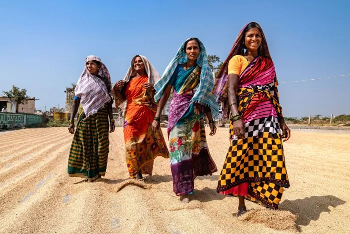 精米所で働く女性たち。天日干しするために地面に広げたお米を、