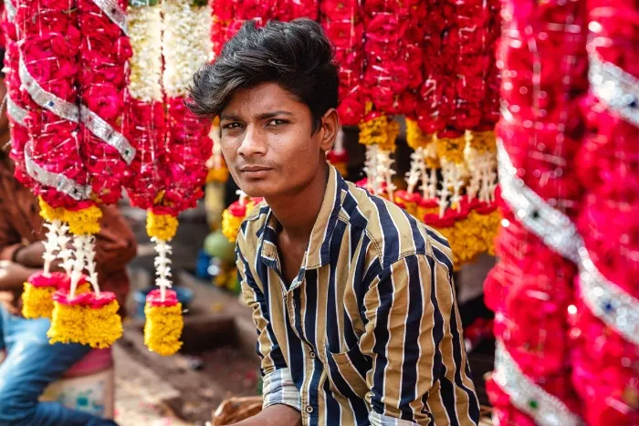 市場で花飾りを売る男性。インドの宗教儀式では、バラやマリー