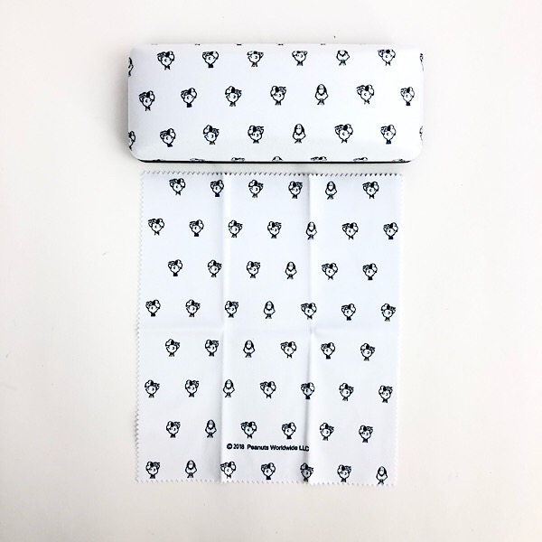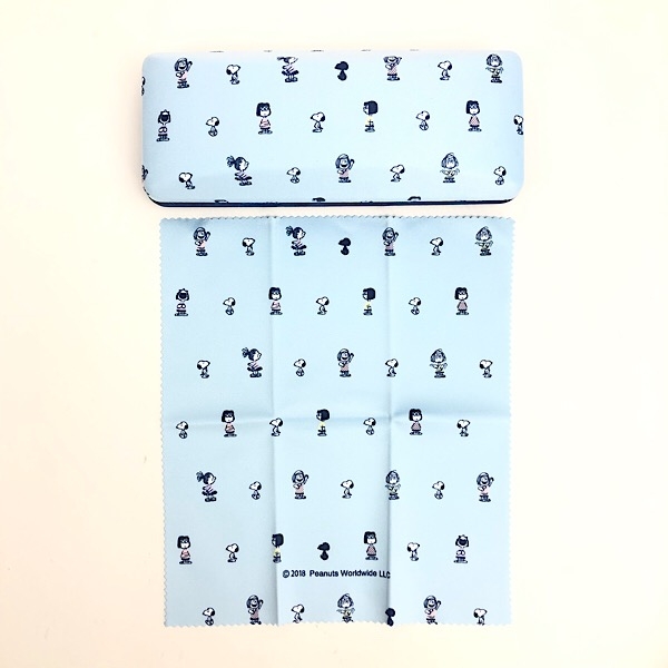 パステルブルーのメガネケースには、PEANUTSの女の子たちが登場しています。