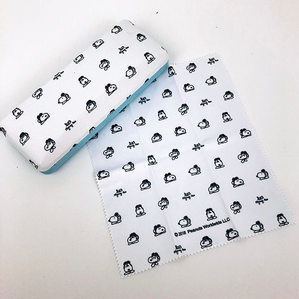 フライングエースのデザインのメガネケースです♪スヌーピーのフェイスがたくさん描かれていて、楽しくなりますね。クロスも同柄で、優しくメガネを守ってくれますよ。