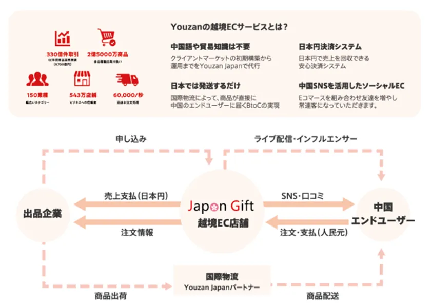 Youzan Japanの越境ECは、CHINA YOUZANのECプラットフォーム「Youzan」を活用して、越境ECに必要な販売サイトの開設や出店申請、国際物流、売上金を日本円で入金するなど、『Japan Gift』参加する事業者の中国市場進出をスタートアップから費用回収までサポートします。