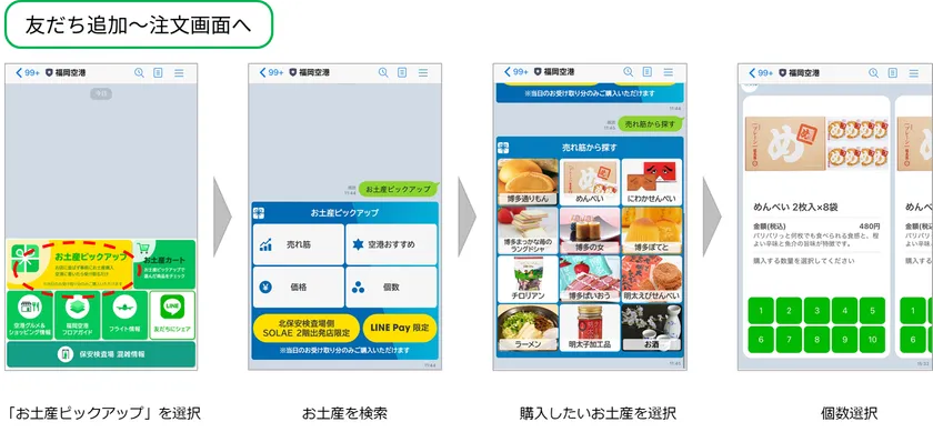 お客様により快適に過ごしていただくために、ホームページのリニューアルなど日々改善に努めておりますが、その一環として、今般、LINE Fukuokaと共同で福岡空港公式アカウントに「お土産ピックアップ」、「フロアガイド・ショップ・フライト情報」を用意した実証実験を開始いたします。