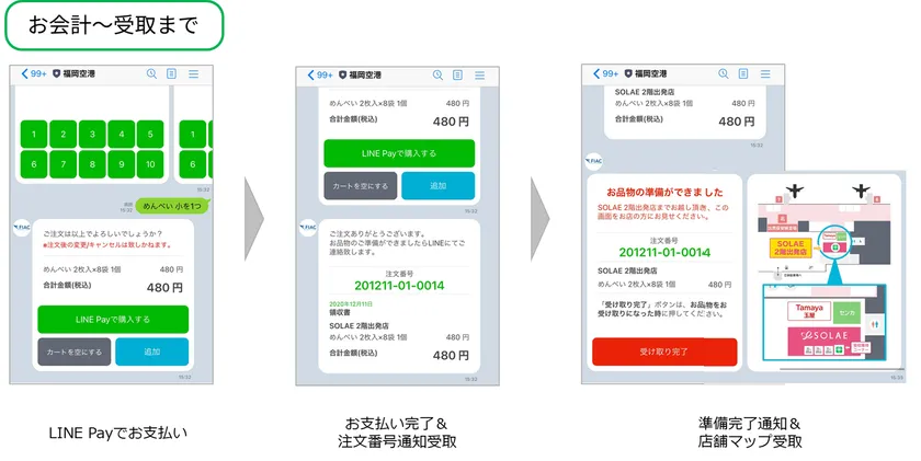 商品の注文~決済、提供準備完了のお知らせまでをLINEのトークルーム上で完結できる機能です。これまで、過去に1Dayイベント等で導入してきましたが、常設店舗への導入は本件が初となります。