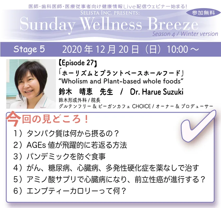 =医師・歯科医師・薬剤師向け無料Liveウェビナー= 《Sunday Wellness Breeze, Season 4, Stage 5(Episode 27)》12月20日(日)開催!