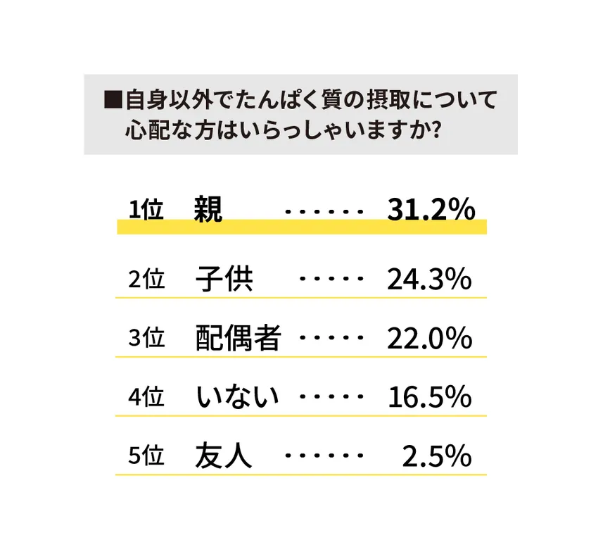 たんぱく質の摂取について、自身以外でたんぱく質摂取について心配な人を聞いたところ、身近な家族を挙げる人が多いことがわかりました。そのうち、親に対する心配が1位という結果が出ています。