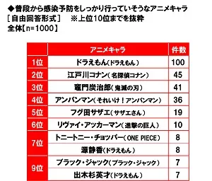 また、普段から感染予防をしっかり行っていそうなアニメキャラを聞いたところ、「ドラえもん(ドラえもん)」がダントツ、2位「江戸川コナン(名探偵コナン)」、3位「竈門炭治郎(鬼滅の刃)」となりました。
