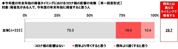 今年度の年末年始に帰省すると思う人(222名)に、帰省するタイミングにコロナ禍の影響はあるか聞いたところ、「例年より早くすると思う」が19.4%、「例年より遅くすると思う」が10.4%となり、例年とは異なるタイミングで帰省するという人は29.7%でした。混雑による密を避けようと考えている人は少なくないようです。