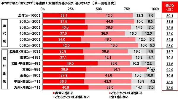 全回答者(1,000名)に、コロナ禍のおでかけ(帰省除く)に抵抗を感じるか、感じないか聞いたところ、「非常に感じる」は38.1%、「どちらかといえば感じる」は42.0%で、合計した『感じる(計)』は80.1%となりました。大多数の人がコロナ禍のおでかけに対し抵抗を感じているようです。