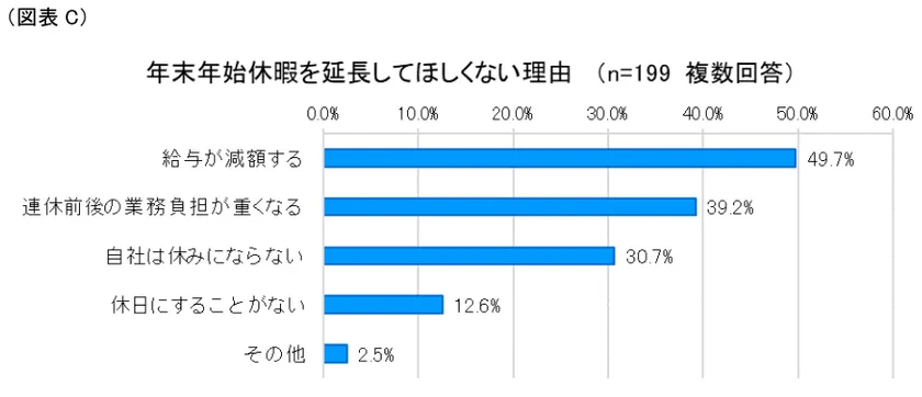 上記(2)における「延長をしてほしくない」の回答者に理由を調査したところ、1位は「給与が減額する」(回答率49.7%)となり、2位「連休前後の業務負担が重たくなる」(同39.2%)、3位「自社は休みにならない」(30.7%)と続きました。給与の減額や業務負担の増加に対する不安から年末年始休暇を延長してほしくないと回答していることが分かりました。(図表C)