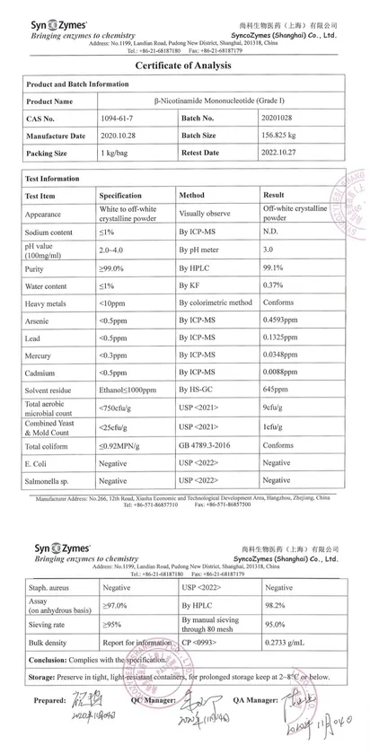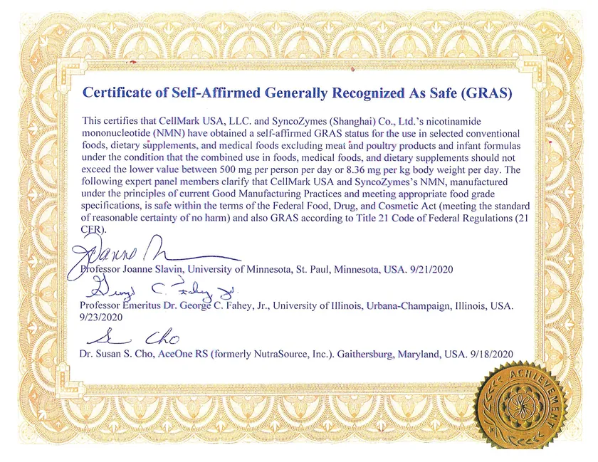 NMN DDS 9000は、アメリカFDAの安全性審査制度においてのGRAS(Generally Recognized As Safe)認定を取得。日本の工場では製品試験検査成績表、製造時出荷判定書の合格証明書を取得し、さらに中国では製品の成分分析試験を行い、証明書を取得しています。