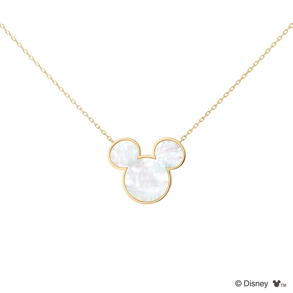 「ミッキー」のアイコンをかたどったマザーオブパールがエレガントにきらめくネックレス。ペンダントトップ部分は縦が1.8cmほどの大きさで、貝ならではのつややかな光沢をしっかりと楽しめます。