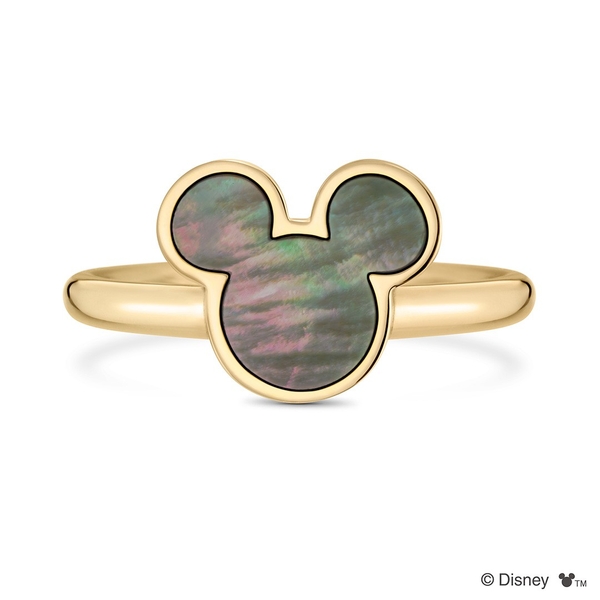 「ミッキー」のアイコンをかたどったマザーオブパールがエレガントにきらめくリング。アイコン部分は縦が1cmほどの大きさで、手元でパッと目を惹く存在感があります。
