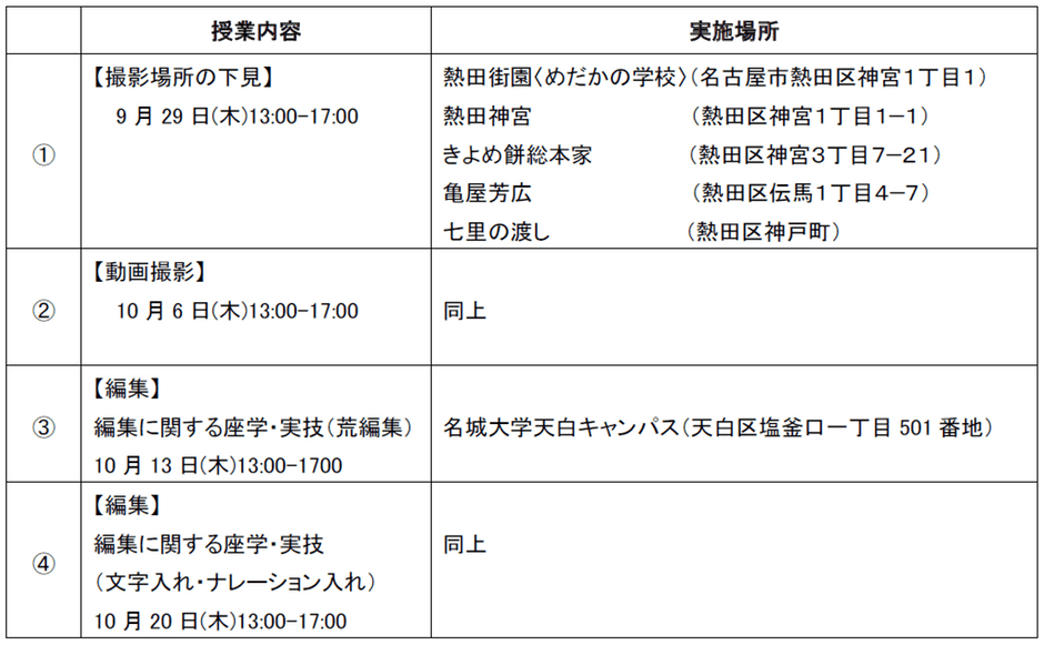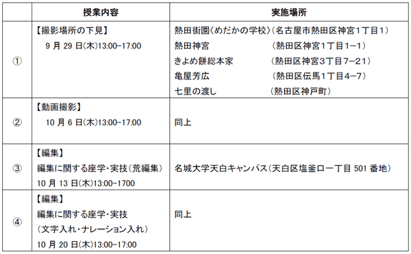 以下のスケジュールでロケ・編集を行う予定です。報道各社さまには名城大学の学生が動画作成をしている様子を撮影・取材いただけます。取材をご希望の前には、準備の関係から撮影日3日前までに文末の問い合わせ先までご連絡をお願いいたします。