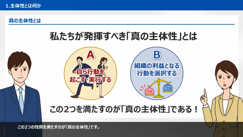 「知って役立つ!主体性アップ講座」では、真の主体性とは何かを理解して自ら行動を起こすこと、そして組織の利益となる行動を選択することの必要性を認識するとともに、真の主体性を発揮するためにどのような行動をとるべきかを学べます。昨今増加しているテレワークがまさに真の主体性が求められる環境であり、本コースの受講により社員の意識改革を目指します。