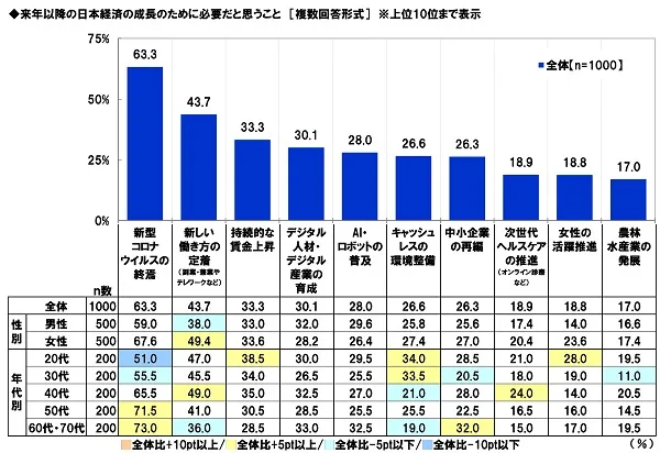 まず、全回答者(1,000名)に、来年以降の日本経済の成長のために必要だと思うことを聞いたところ、1位「新型コロナウイルスの終焉」(63.3%)、2位「新しい働き方の定着(副業・兼業やテレワークなど)」(43.7%)、3位「持続的な賃金上昇」(33.3%)、4位「デジタル人材・デジタル産業の育成」(30.1%)、5位「AI・ロボットの普及」(28.0%)となりました。