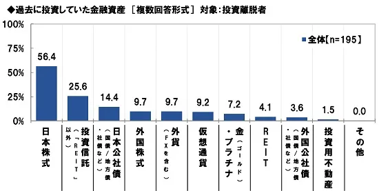 他方、投資離脱者(195名)に、過去に投資していた金融資産を聞いたところ、こちらも「日本株式」(56.4%)が最も高く、以降、「投資信託」(25.6%)、「日本公社債」(14.4%)、「外国株式」と「外貨」(いずれも9.7%)が続きました。