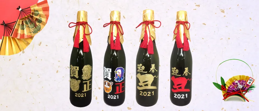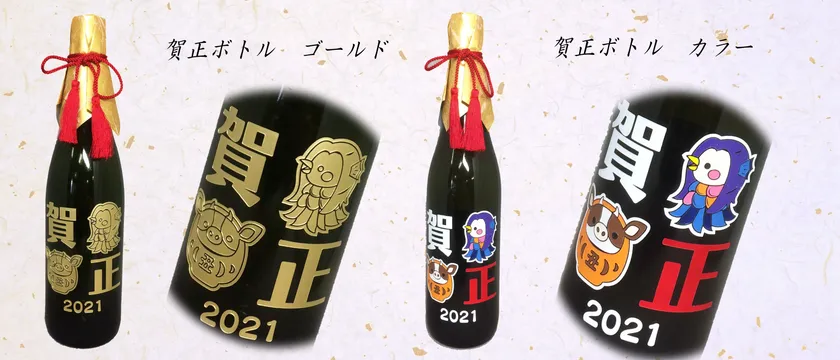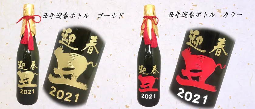 当社独自の「彫刻と塗装」技術を駆使した、ボトル彫刻「tekizami 丑年迎春ボトル純米大吟醸」「tekizami 賀正ボトル純米大吟醸」。