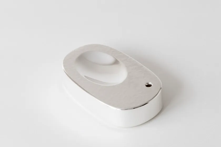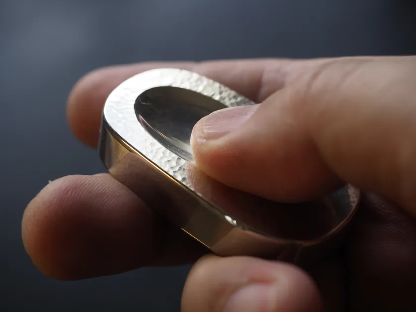 表面はつち目をつけ、側面やくぼみ部分の鏡面と質感を変えています。ピカピカの鏡面仕上げの滑らかな感触とつち目仕上げのわずかに抵抗感のある感触、それぞれをとことん楽しめるようにしました。また、面取りも表と裏で異なります。手の中で転がしている時に多様な触り心地がたのしめるよう、細部にまでこだわって設計しました。