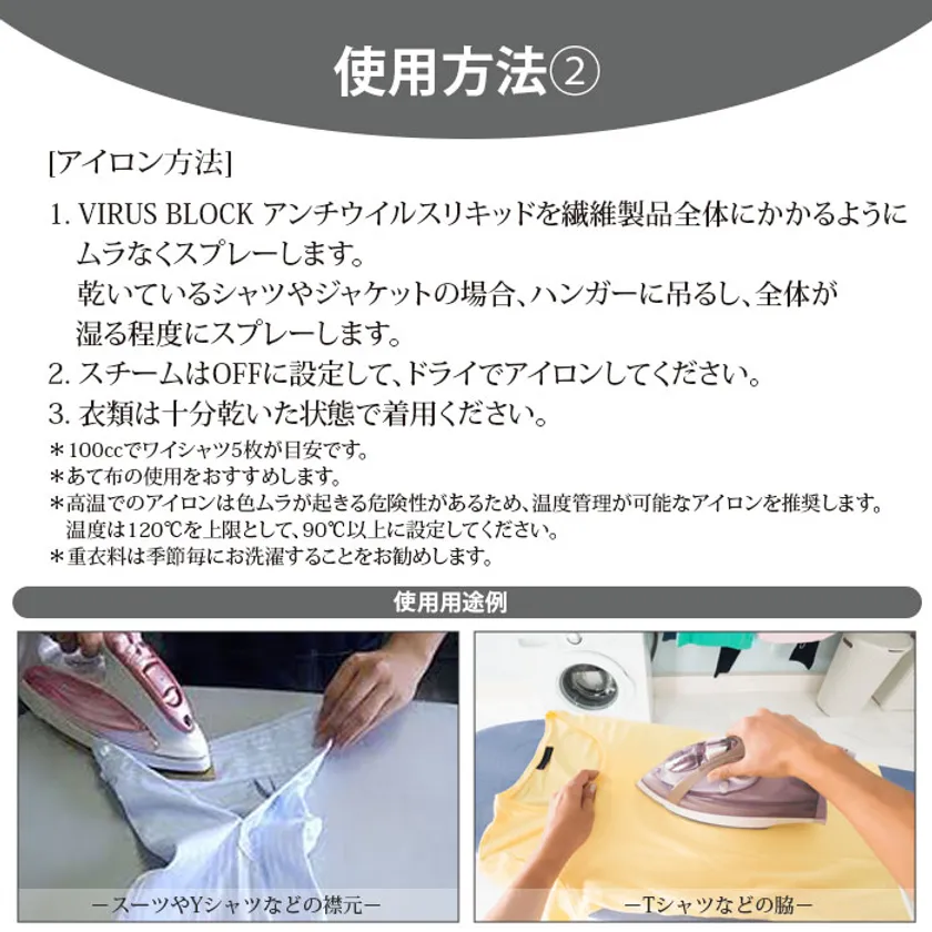 ウイルスブロック アンチウイルスリキッド-アイロンで熱を加えることで最多150回洗濯しても抗菌・抗ウイルス効果を維持