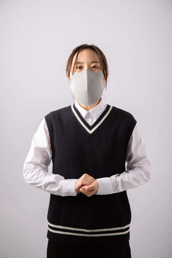 本製品は表生地裏生地ともに抗菌生地を使用しており、100回洗濯しても抗菌効果が持続するリブフレッシュPスーパーを使用した立体マスクの形状を変更し、発声時に大きく動く下あごへの接触を減らすことでマスクが上下に移動しなくなりました。また口部分は当社のシリカクリン生地を使用することでマスク内の湿気やニオイを除去し、快適に過ごすことができます。発声時、自身の飛沫を最小限に抑え、室内上部からの飛沫を抑え、飛沫感染を最小限に抑える効果が望めます。