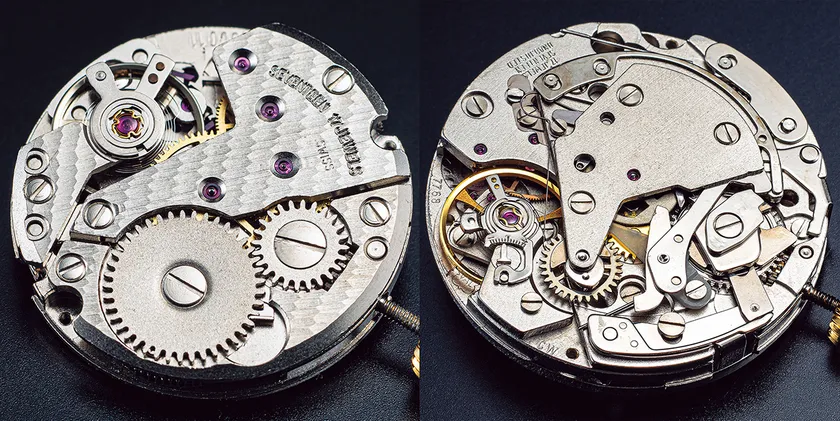 右がバルジュー社の手巻きクロノグラフキャリバー7768。左がフォンテンメロン社の手巻きキャリバー、FHF138。どちらも1990年代に製造を中止したオールドムーヴメントです