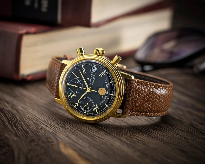 そして、このモデルの魅力は何と言ってもムーンフェイズ(月齢表示)にあります。その小窓も大きく、しかもディスクに描かれた月にはいまでこそほとんど表現されなくなった顔が描かれており、アンティークウオッチさながらの古典的な雰囲気が楽しめます。製品化できたのはわずか17本と希少です。