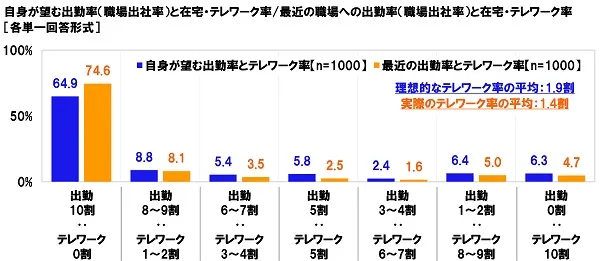 最近の職場への出勤率(職場出社率)と在宅・テレワーク率を聞いたところ、こちらも最多回答は「出勤10割:テレワーク0割」で74.6%でした。また、実際のテレワーク率の平均は1.4割となりました。