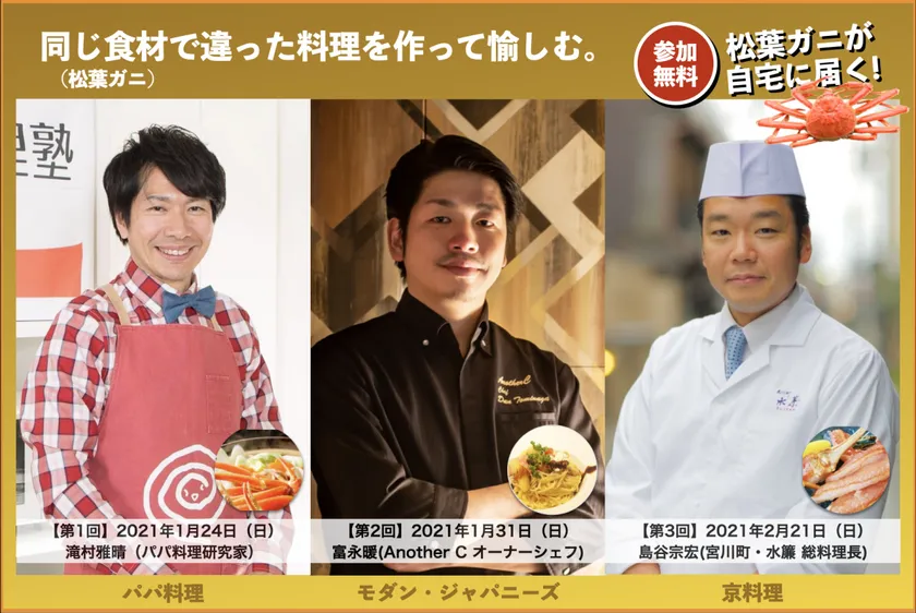 プロの料理人・料理研究家から学ぶ松葉ガニを使った 参加費無料のオンライン料理教室の 申込受付を1月12日よりスタート。