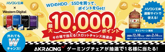 期間中にWD製 内蔵HDD、及び内蔵SSDをご購入のお客様を対象として、特設キャンペーンサイトでの抽選ゲーム画面にて、パソコン工房 Web サイトで利用可能な最大10,000ポイントがあたるキャンペーンを行います。