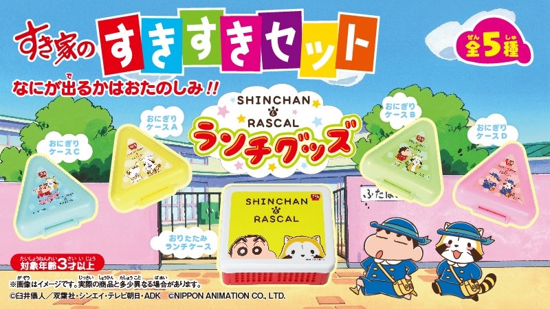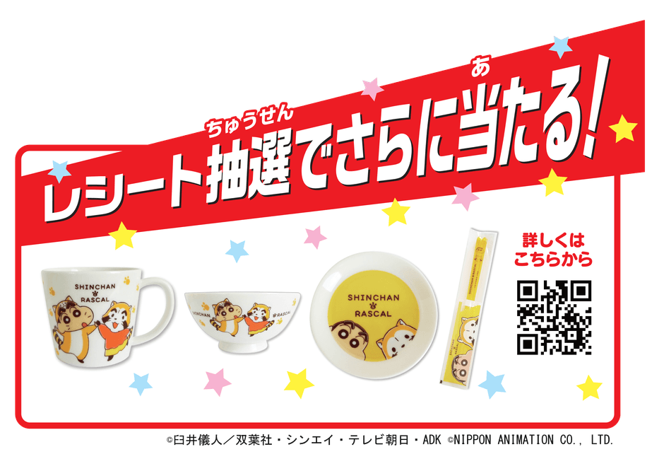 同キャンペーンでは、期間中に全国の「すき家」各店でメイン商品に加えてすきすきセットをご注文いただいた方に「ラスカル」と「クレヨンしんちゃん」のコラボレーションランチグッズをプレゼントいたします。また、前述のお買い上げレシート情報をご入力いただいた方の中から抽選で、50名様にコラボ食器セット(マグカップ、お茶碗、クリア箸、ミニプレート)とランチグッズ全種(おにぎりケース4種、おりたたみランチケース)をプレゼントいたします。応募方法などの詳細は「すき家」の公式Webサイト、SNSで公開中です。